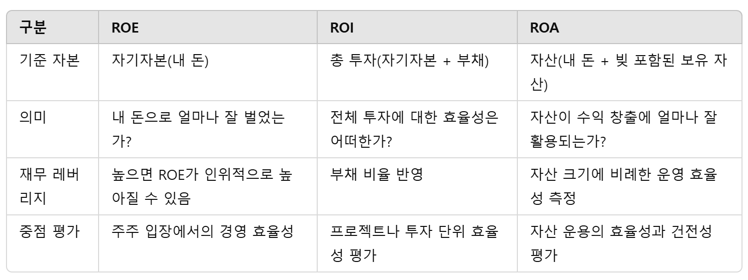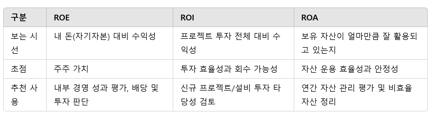 ROI는 “이 투자 괜찮을까?”를 묻는 질문이고, ROA는 “내 자산이 잘 일하고 있는가?”를 점검하는 도구이며, ROE는 “내 돈이 얼마나 잘 불어나고 있는가?”를 최종적으로 평가하는 지표이다.