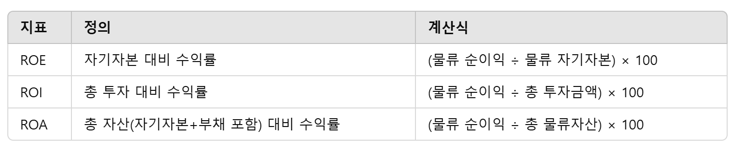 물류에서 ROE, ROI, ROA는 각기 다른 관점을 보지만, 결국 하나의 자금 흐름 속에서 연결된 지표들이다.