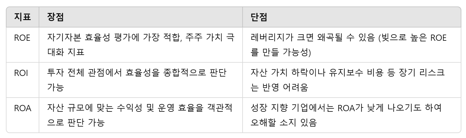 ROI는 “이 투자 괜찮을까?”를 묻는 질문이고, ROA는 “내 자산이 잘 일하고 있는가?”를 점검하는 도구이며, ROE는 “내 돈이 얼마나 잘 불어나고 있는가?”를 최종적으로 평가하는 지표이다.