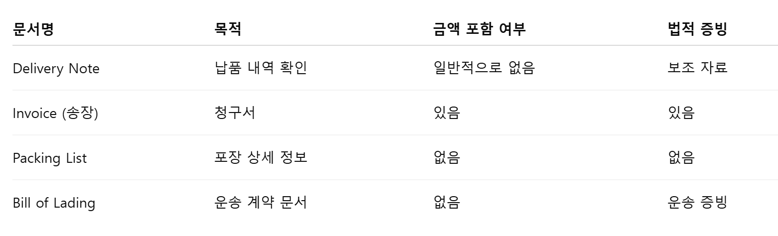 Delivery Note는 납품되는 상품의 상세 목록을 포함한 문서로, 일반적으로 다음의 목적을 위해 사용됩니다.
